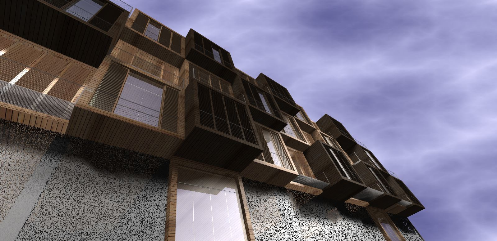 Nakoľko parter je tvorený polyfunkciou a fasádu tvorí len presklená stena, cela obytná časť bude pôsobiť ako monument vznášajúci sa nad zemou.