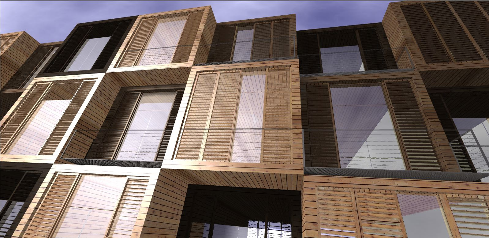 Ako tieniaca technika sú použité posuvne okenice, ktorých rám je tvorený iba 5mm hrubým hliníkovým plechom s bridlicovo sivou povrchovou úpravou a otočnými listami na baze kompozitu v 3 farebných odtieňoch ako fasáda.