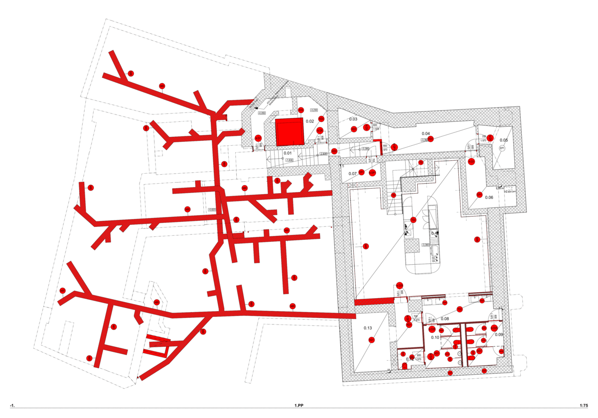 Aby sme dokázali poňať a pristúpiť k zadaniu komplexne, objekt sme preniesli do 3D virtuálneho prostredia. To umožnilo plynulý a detailný postup obnovy dôležitých historických prvkov pôvodnej architektúry. Zapracovanie technológii vzduchotechniky, chladenia a kúrenia v objekte bolo neporovnateľne čitateľnejšie a predvídateľne koordinovateľné. Za viaceré príklady spomenieme návrh jedinečného systému chladenia s interiérovými kondenzačnými jednotkami, ktorým sme eliminovali umiestnenie kondenzačných jednotiek priamo na fasádach objektu. Podarilo sa nám zrušiť existujúce kondenzačné jednotky na fasádach a tým sme docielili čistý vzhľad fasád vo vnútroblokoch a nechali tak vyniknúť jej štruktúru a tvaroslovie , ktoré je viditeľné z hradného kopca a okolitej zástavby.