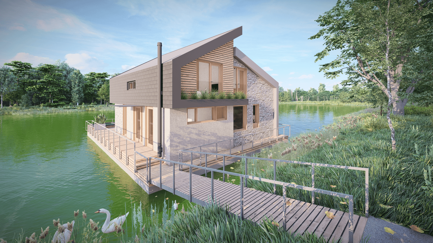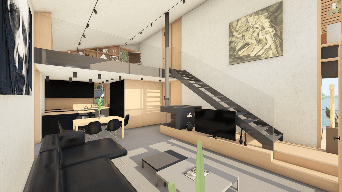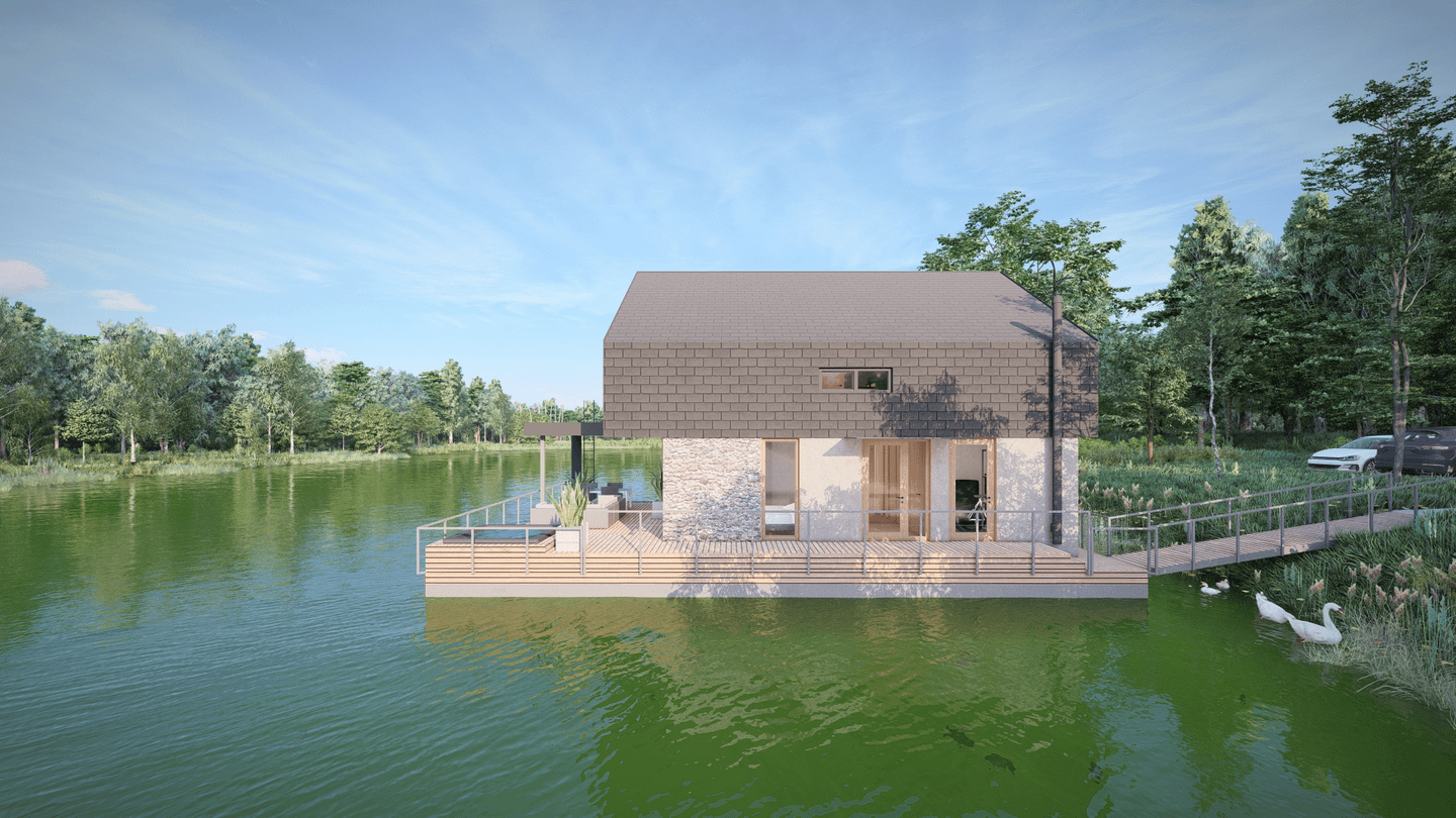 Plošne väčšia časť, je pri nižšej hmote venovaná aktívnemu pobytu, opticky prepojená s brehom i vodnou hladinou. Veľkorysá výška strešnej roviny umožnila vytvoriť platformu pre oddych pri knihe, no zároveň tvorí vstup do tichej súkromnej časti objektu.