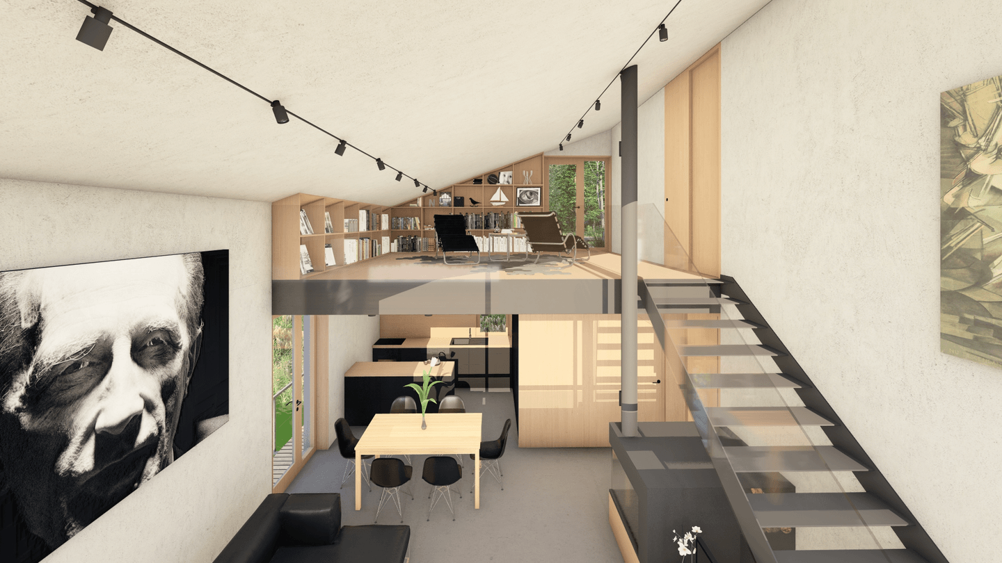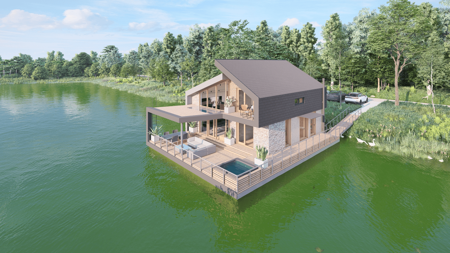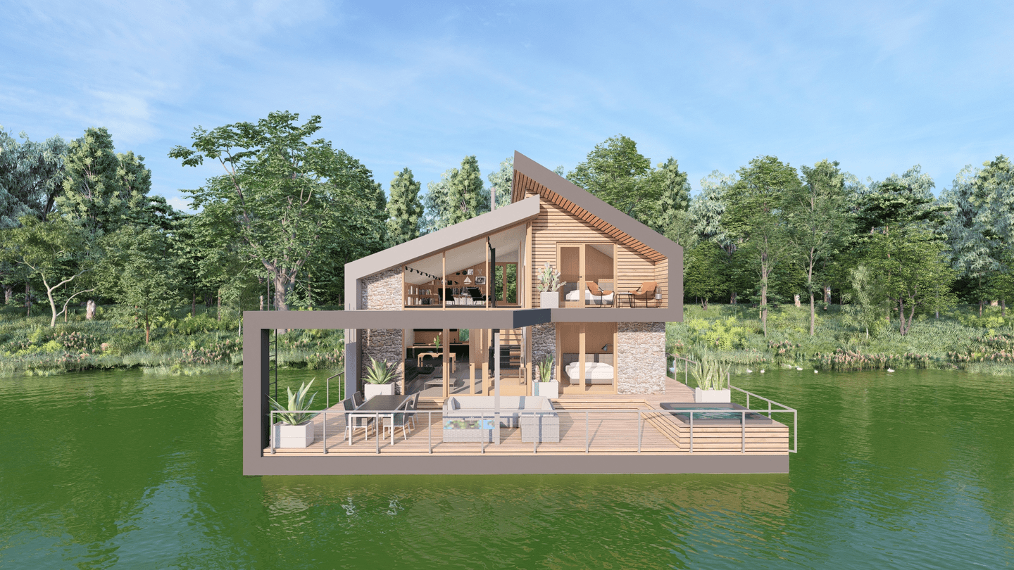 Plošne väčšia časť, je pri nižšej hmote venovaná aktívnemu pobytu, opticky prepojená s brehom i vodnou hladinou. Veľkorysá výška strešnej roviny umožnila vytvoriť platformu pre oddych pri knihe, no zároveň tvorí vstup do tichej súkromnej časti objektu.