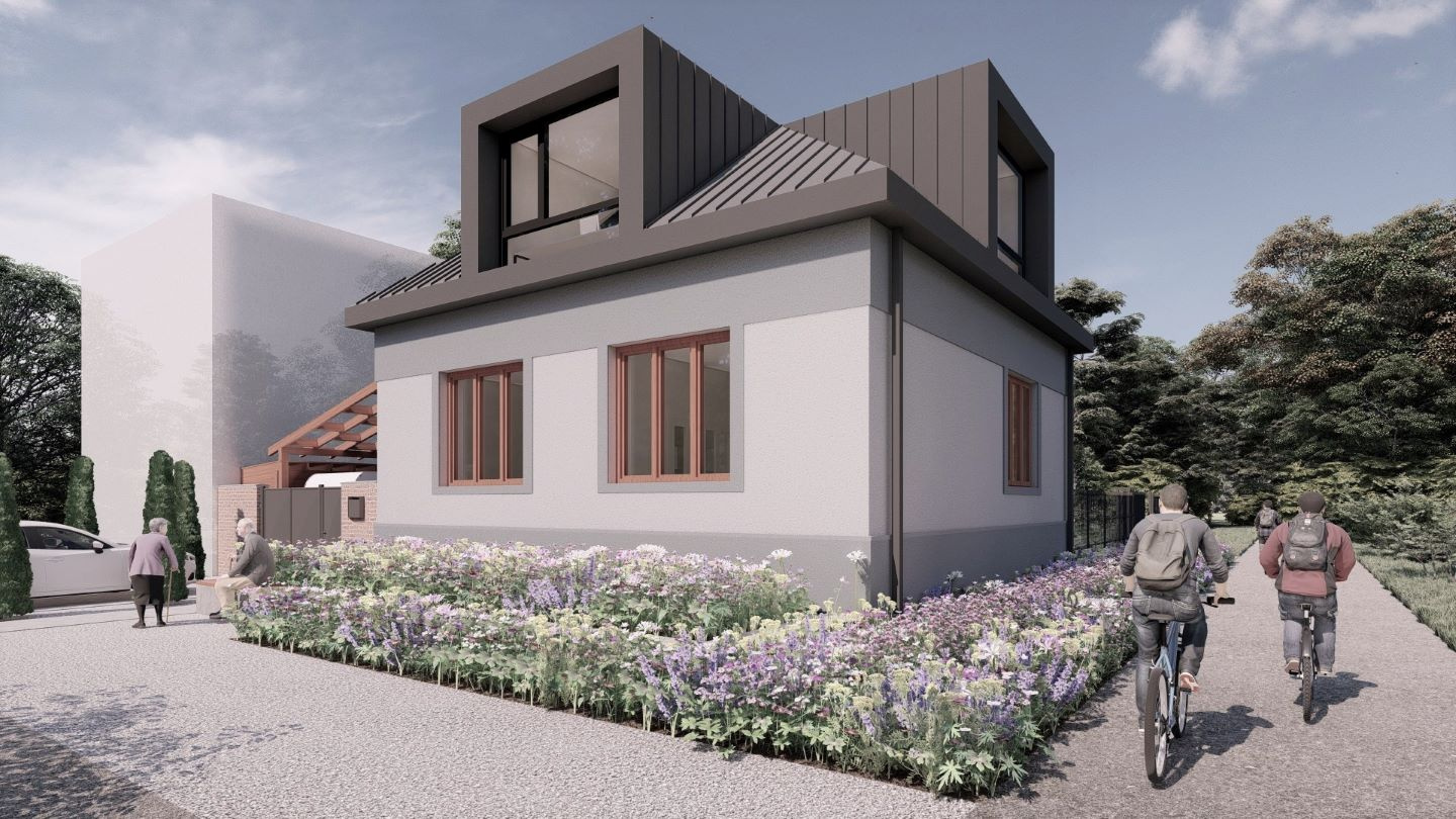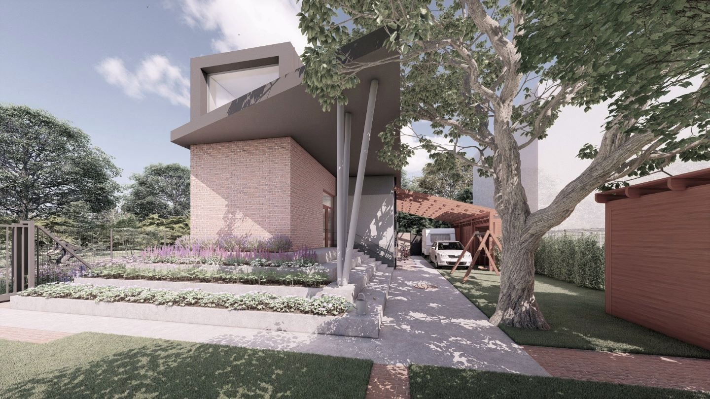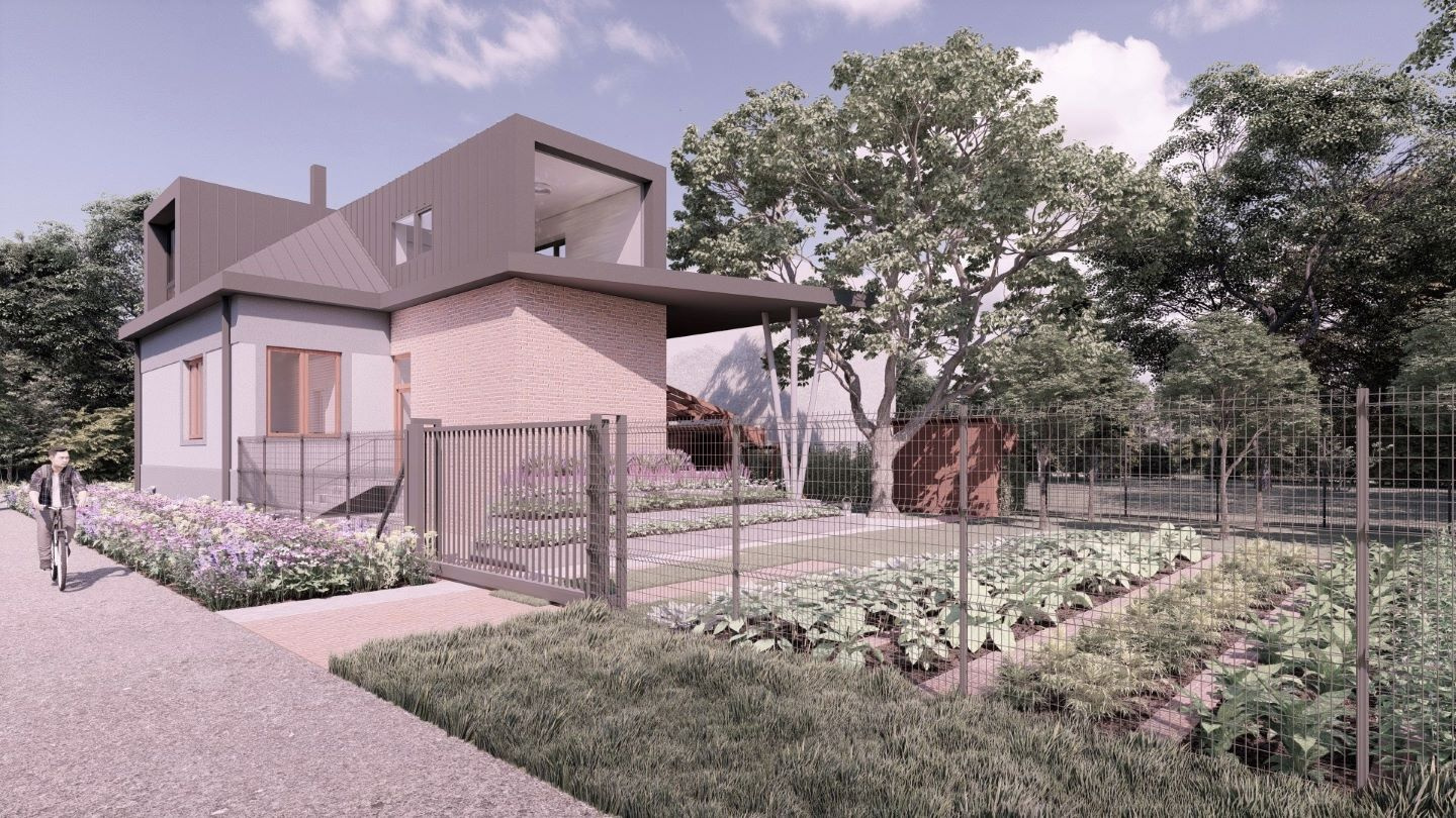Odstránením oplotenej predzáhradky a oplotenia medzi záhradnou a úžitkovou časťou dvora sa dom podarilo otvoriť do ulíc. Prechodovú formu medzi domom a záhradou, tvorí systém vyvýšených záhonov pre pestovanie byliniek s možnosťou posedia a opekania v chodníku ukrytom ohnisku.
