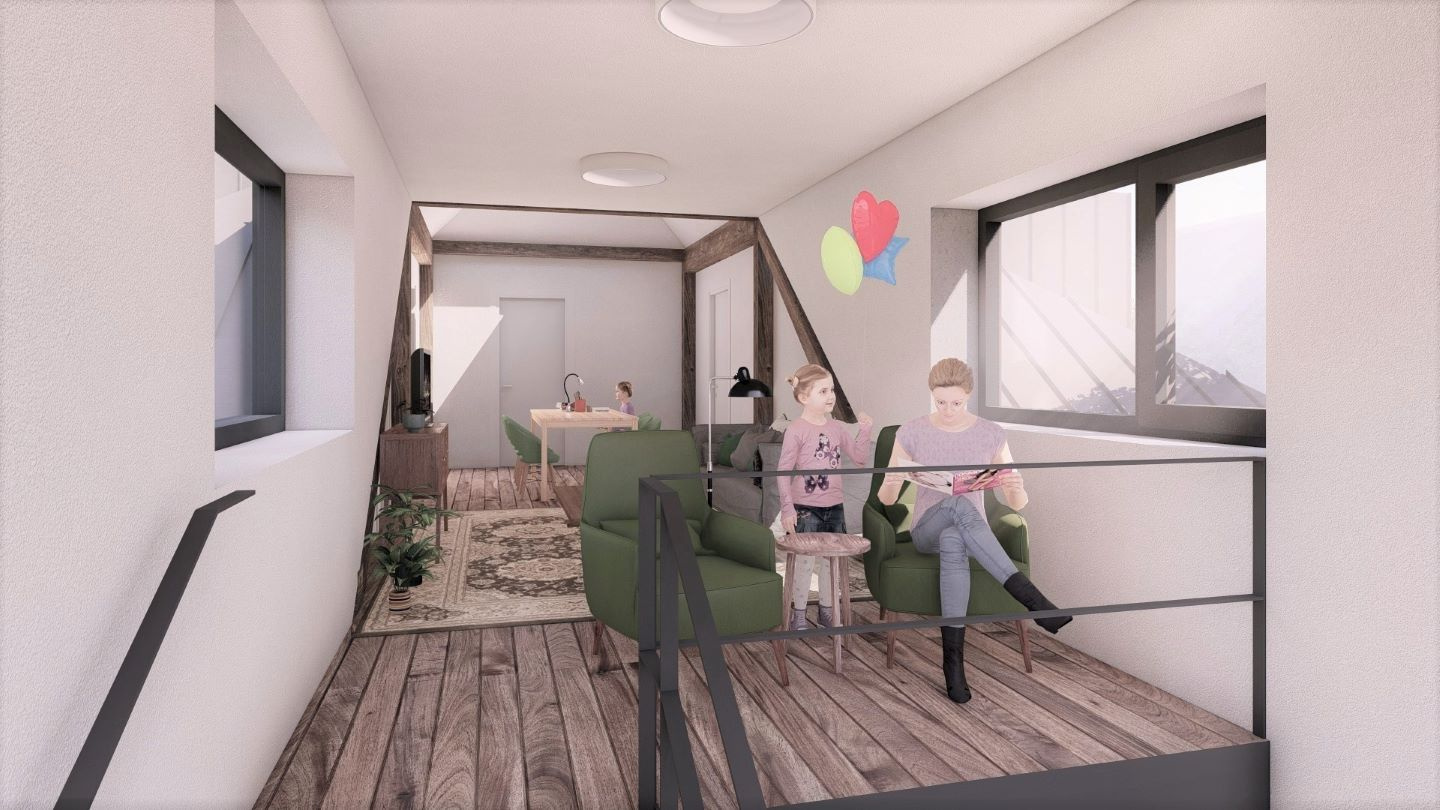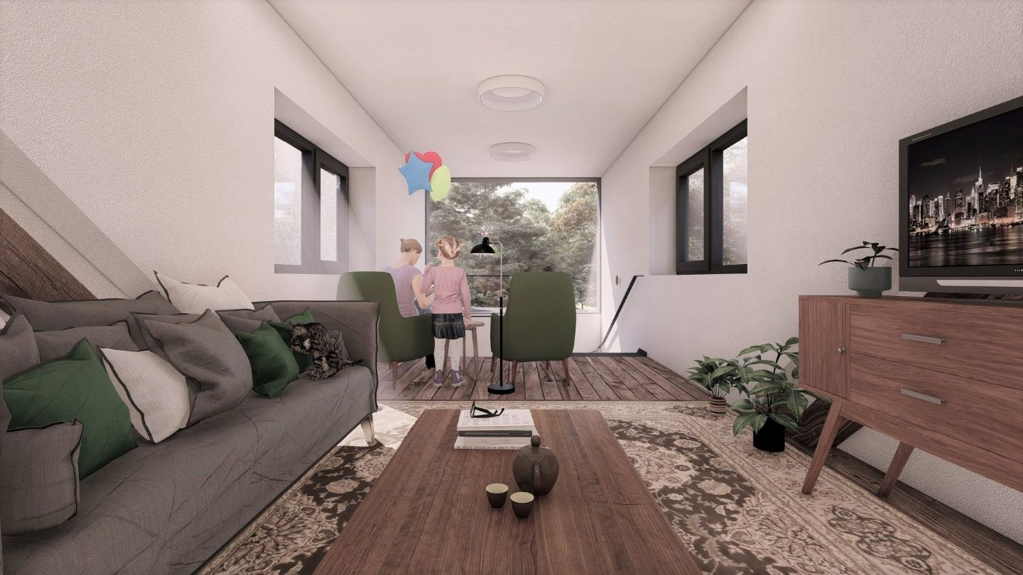 Nakoľko sa im medzičasom rozrástla rodina o dve malé dcérky, zadaním bolo zobytnenie povalového priestoru pre mladú generáciu. Rátalo sa však s ponechaním pôvodnej nosnej konštrukcie strechy, ktorú tvorila stojatá stolica. Pripúšťalo sa len odstránenie prístavby.